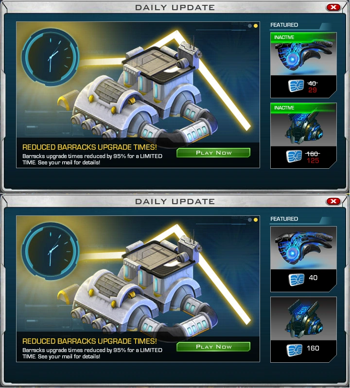 | “ | Still haven't built your Level 13 Command Center, Fleet Academy or unlocked all the levels of your Defense Simulator? Now is your chance to purchase Cerulean Cores for the low price of 29 Platinum until 3:00pm PST, August 20th. Now get out there and start building! | ” |