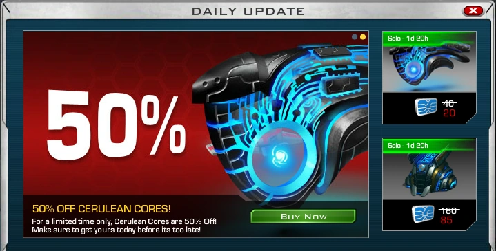| “ | For a Limited Time, Cerulean Cores and Racks are on sale for 50% off their normal price! This item is required to level up certain buildings from level 10 -- 14, so there has never been a better time to stock up!