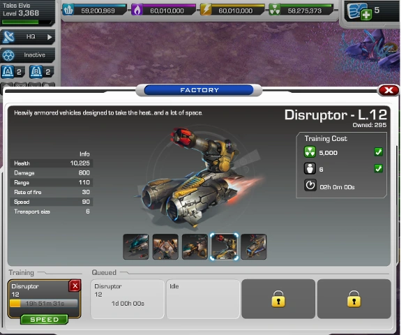 Factories train mechanized units and allow you to build Neutron Mines at Level 9. More Factories allow you to queue additional training orders. Upgrade to increase building health and build Neutron Mines.