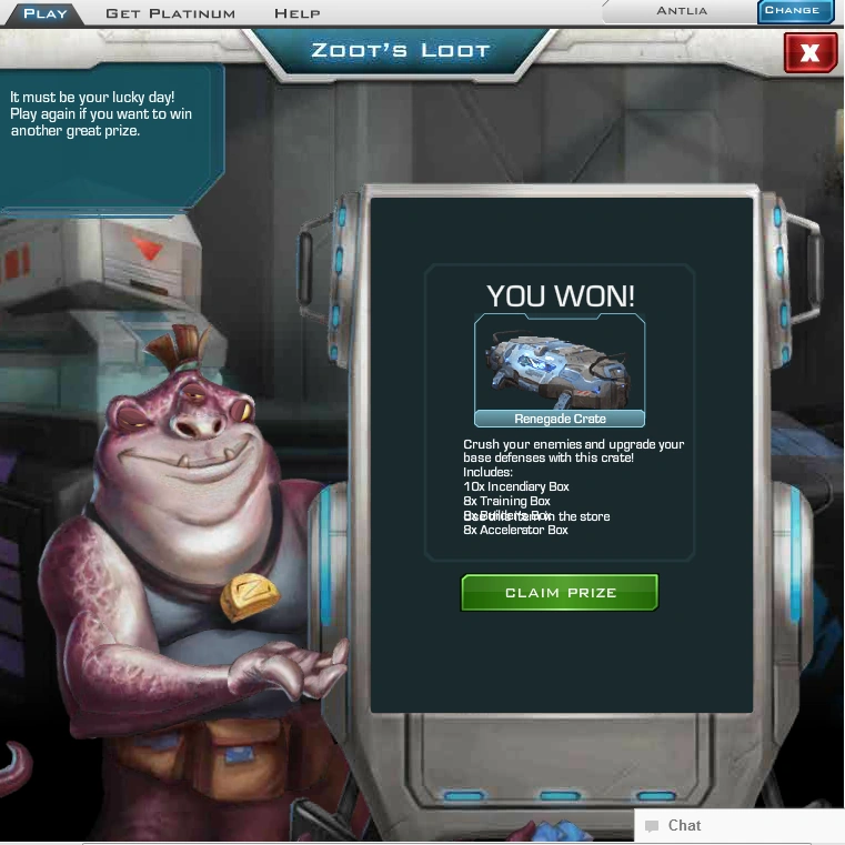 For a limited time, the Renegade Crate is on SALE for only 125 Platinum! This crate contains TEN Incendiary Boxes, 8 Builder's Boxes, 8 Training Boxes, 4 Mystery Carriers, 5 Zoot Tokens AND 5 Accelerator Boxes! BONUS: Between now and 2:00pm PDT on October 23rd, every 3 Renegade Crates you buy will earn you 1 Renegade Crate FREE! (Limit 10) This deal is limited to 10 prizes. Prizes will be given by 12:00pm PDT on October 24th.